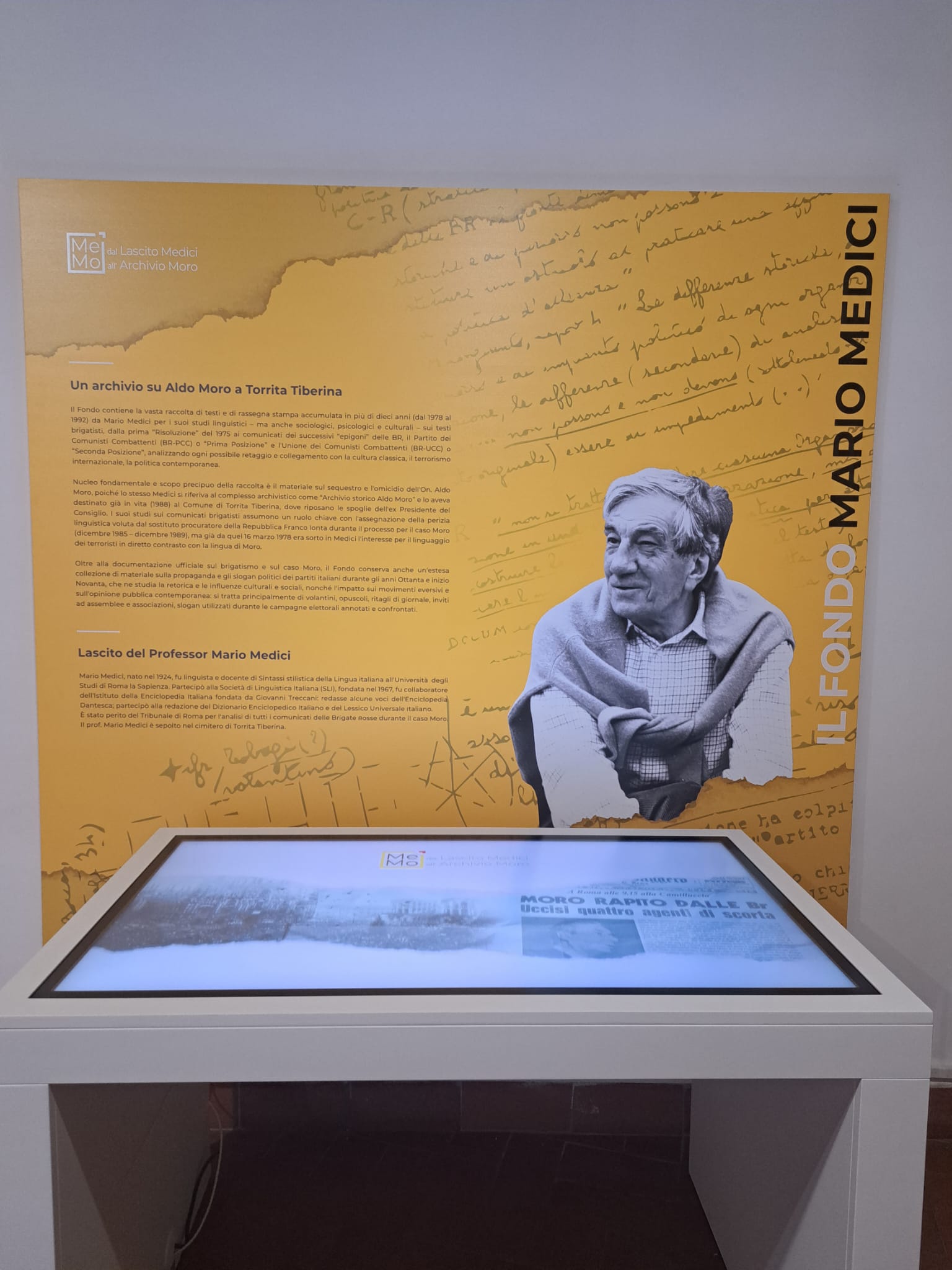 Lo spazio museale Me.Mo. nasce grazie ad un finanziamento della Regione Lazio del 2022. Si configura come archivio storico all’interno del Palazzo Baronale Savelli di Torrita Tiberina, che ospita il lascito di Mario Medici (1924-1992), linguista e docente dell’Università degli Studi di Roma “La Sapienza”. La documentazione venne destinata dallo stesso Medici al Comune di Torrita Tiberina già in vita, per la stima reciproca che si era creata durante gli ultimi anni di lavoro tra il professore e l’amministrazione, nonché per i legami di Aldo Moro con il Paese dove riposano le sue spoglie.