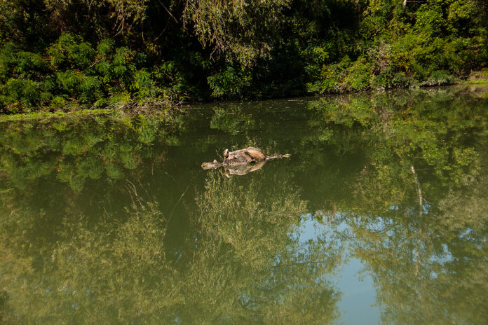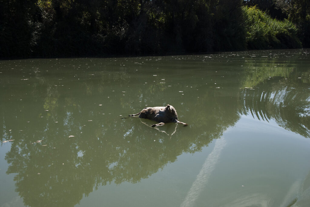 Alla deriva da giorni, in avanzato stato di decomposizione, le carcasse gonfie erano quasi immobili sulle acque delle anse. Sembrava aspettassero una spinta per andare avanti o affondare definitivamente al fondo di 12 metri e diventare materiale organico. A disposizione dei giganteschi pesci siluro che nel tratto percorso abitano in buon numero.
