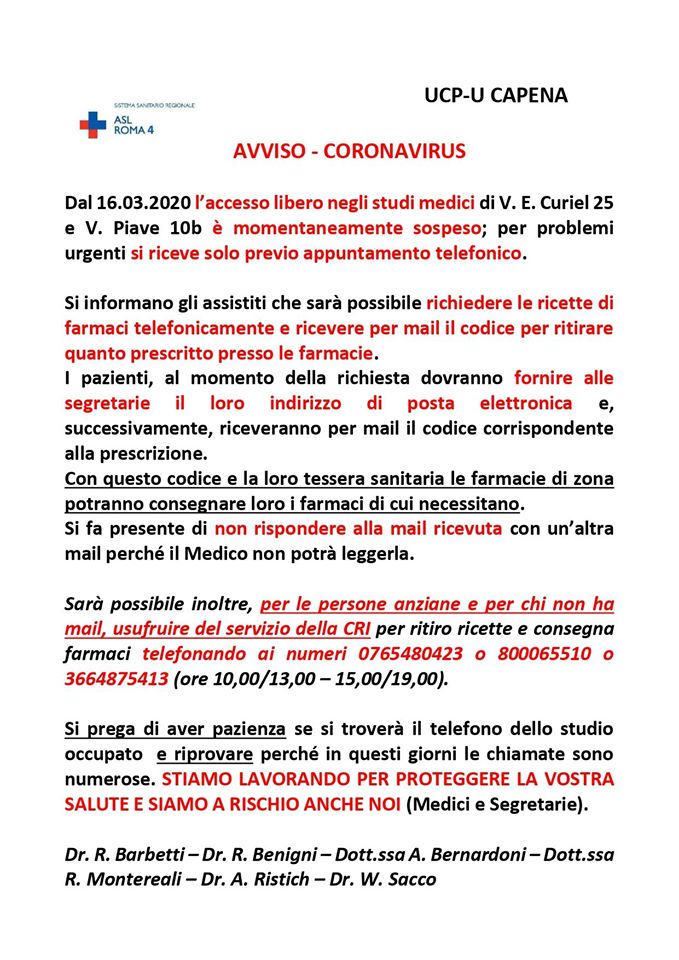 I medici di medicina generale di Capena vietano l’accesso libero ai loro studi da domani lunedì 16 marzo. Il divieto è momentaneo e riguarda gli studi di via E. Curiel 25 e via Piave 10b. Richieste di visite e di ricette potranno essere fatte telefonicamente. Ecco il testo dell’annuncio.