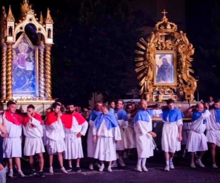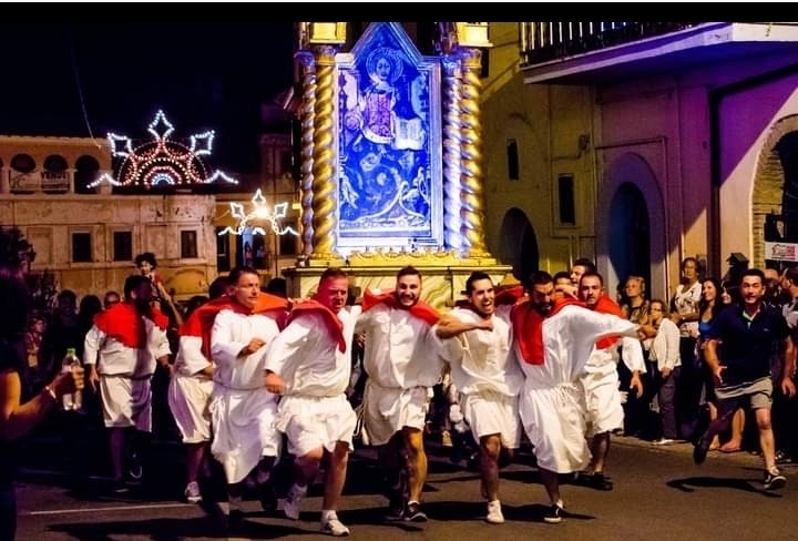 È l’incontro tra Maria e suo figlio, Cristo Salvatore, rappresentati dalle immagini sacre esposte su due imponenti strutture chiamate “macchine”; sotto di queste ci saranno loro, gli incollatori, 8 per ogni santo.
