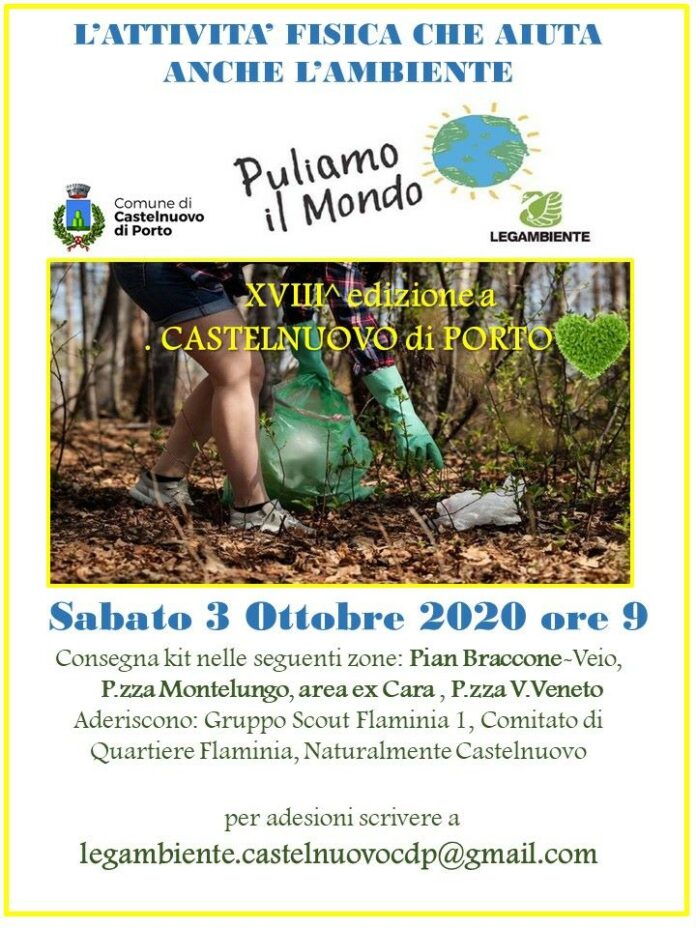 Sabato 3 Ottobre 2020 dalle ore 9 torna la 18^ edizione di Puliamo il Mondo a Castelnuovo di Porto, la storica campagna di volontariato ambientale organizzata da Legambiente con il patrocinio del Comune, che chiama all’azione tantissimi volontari e cittadini per ripulire dai rifiuti abbandonati strade, vie, piazze, aree verdi.