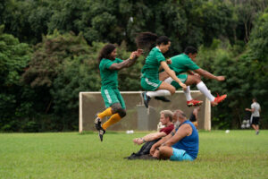 (From L-R): Hilo Pelesasa, Ioane Goodhue, Kaimana and Beulah Koale in NEXT GOAL WINS. Photo Courtesy of Searchlight Pictures.© 2023 Searchlight Pictures All Rights Reserved.