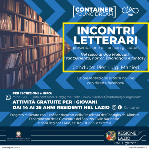Questa terza edizione di Container Young Dream si sofferma con attenzione anche sulla letteratura, attraverso una serie di incontri. Dal 9 ottobre 2021 alle 17: 30 e per cinque appuntamenti, si terrà in diretta streaming sulle pagine social di CIAO LAB “Incontri Letterari – Nel solco di Ugo Malacuti: fantascienza, horror, spionaggio e fantasy”, una serie di presentazioni di libri alla presenza degli autori. L’evento è condotto e moderato dal scrittore, saggista e cultore della materia cinematografica Pier Luigi Manieri. Si inizia con Paolo Di Orazio, autore di “Madre Mostro”, uno dei capisaldi dell’horror italiano pubblicato per la prima volta nel 1991 e si concluderà nel mese di novembre con l’incontro con Armando Corridore per la presentazione di “Fantasy&Science Fiction”, la storica rivista edita in Italia da Elara Libri e distribuita in edicola.