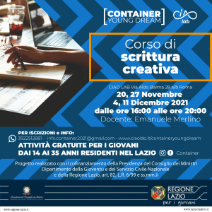 Con l’autunno prendono il via i nuovi appuntamenti di Container – Young Dream, la comunità giovanile promossa dall’Ass.ne CIAO LAB che offre iniziative culturali e formative gratuite per i ragazzi dai 14 ai 35 anni. Sono in partenza laboratori, corsi e incontri pensati per offrire nuove opportunità di conoscenza e confronto ai giovani del territorio. Il 9 ottobre 2021 è in partenza, per cinque sabati consecutivi e in presenza presso la sede di CIAO LAB (via Aldo Balma 28 a/b, Roma), il Corso di Inglese lntermedio condotto da Francesco Maria Prisco (orario 18:00 – 20:00). L’appuntamento, naturale proseguimento dell’omonimo corso base iniziato lo scorso mese di settembre, è rivolto a chi ha già delle conoscenze base della lingua inglese e che vuole approfondire attraverso lezioni di grammatica e conversazione.