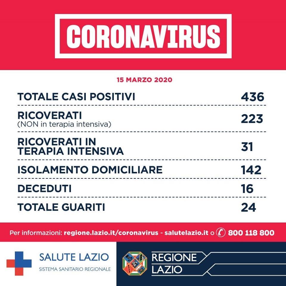 Sono 436 nella Regione Lazio i casi positivi al Covid-19, 79 in più rispetto a ieri.