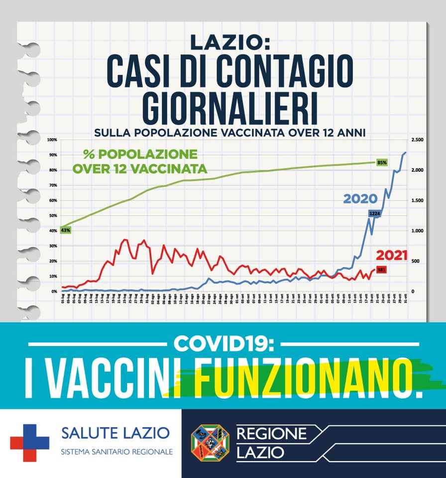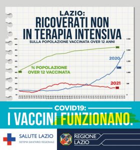 I vaccini funzionano. Per vivere piu’ sicuri e liberi. Oggi rispetto ad ottobre 2020 nel Lazio abbiamo il 69% di contagi giornalieri in meno per Covid, il 61% in meno di ricoverati totali in terapia intensiva e il 74% in meno di ricoverati totali. Numeri definitivi che tolgono ossigeno a tutti le pur legittime perplessità in merito alla necessità della vaccinazione. Lo ha comunicato oggi la Regione Lazio. Discutere ancora non ha senso.