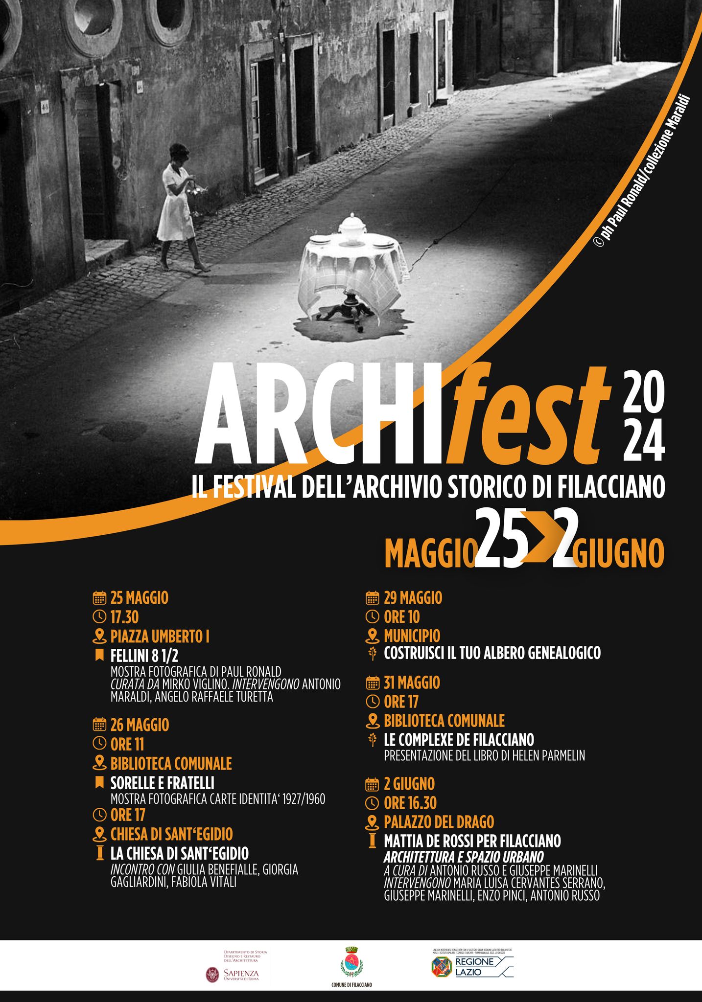 25 MAGGIO, 17.30, Piazza Umberto I: ad aprire il festival l’inaugurazione della mostra fotografica di Paul Ronald dedicata a 8 ½ di Federico Fellini. A cura di Mirko Viglino e con l’intervento di Antonio Maraldi e Angelo Raffaele Turetta