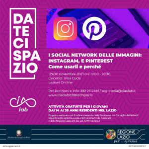 Dal 29 al 30 novembre è in programma il corso sull’utilizzo dei social network delle immagini: Instagram e Pinterest. A condurre le lezioni, che si terranno online, è l’esperta Irina Cuda.