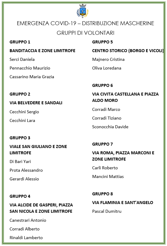 L’Amministrazione Comunale informa che nella giornata di domani il Gruppo di Volontari, reclutati nell’ambito dell’emergenza Coronavirus, inizierà la distribuzione di mascherine alla popolazione di Faleria.