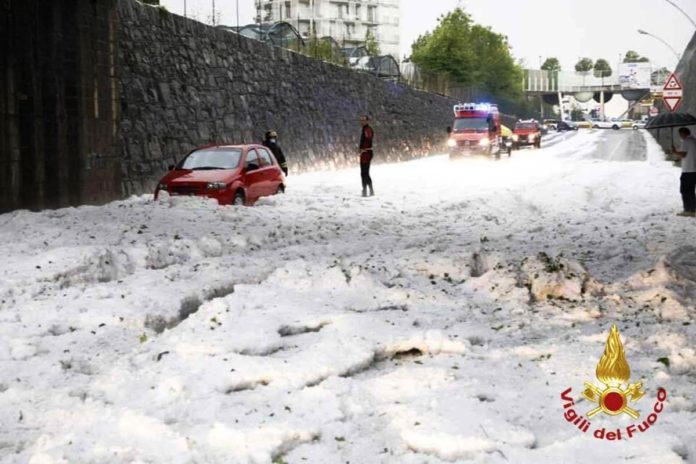 Grandine e allagamenti nel nord Italia. Il maltempo in particolare nei comuni della bergamasca. Tra i paesi più colpiti Alzano e Nembro, particolarmente messi a dura prova dalla pandemia di Coronavirus.