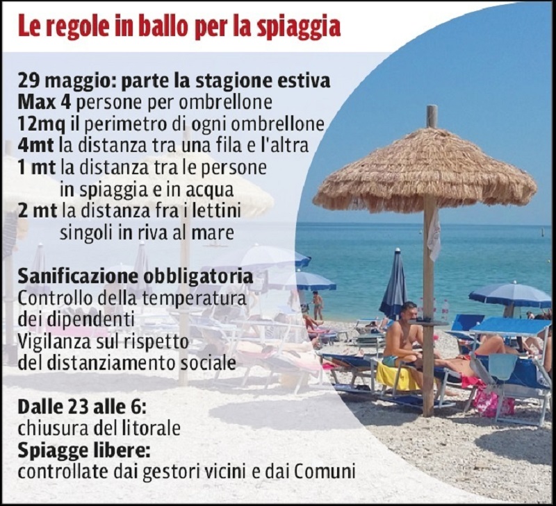 Rimane confermata la presenza del personale, addetto alla reception e all’accompagnamento dei clienti, munito di mascherine e schermature facciali. Tra gli accorgimenti, sarà necessario evitare anche il flusso di monete, per evitare trasmissioni e affini, dunque si procederà rigorosamente per via elettronica o mediante pagamento anticipato. Si al controllo delle temperature e alla sanificazione obbligatoria. Il litorale verrà chiuso dalle 23 alle 6. Le regole per vivere le spiagge in sicurezza saranno rigorose, ma l’idea del check-in sembra essere stata accantonata e sotto l’ombrellone si potrà stare entro un numero di quattro persone, solo per fare un esempio.