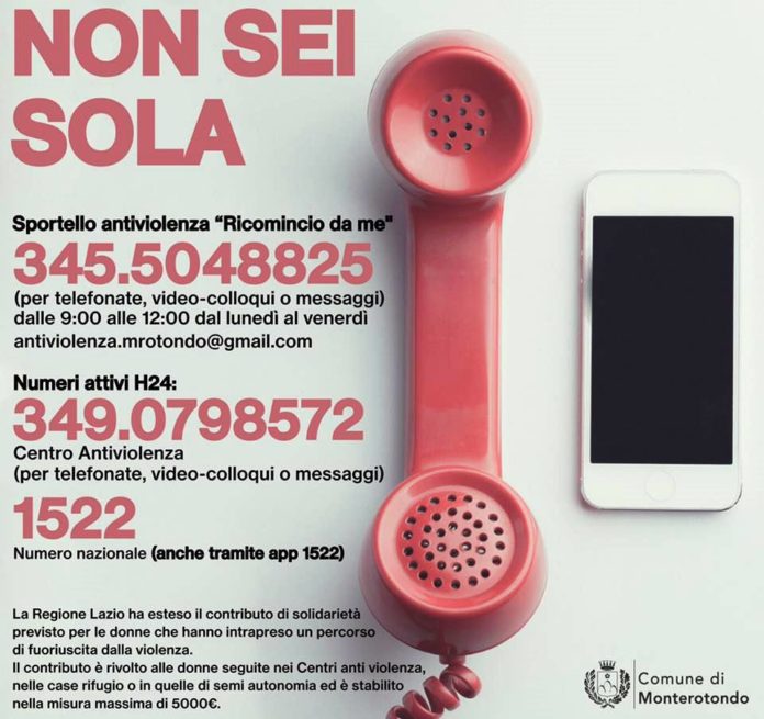 Il Comune di Monterotondo in collaborazione con lo sportello antiviolenza “Ricomincio da me”, gestito da la Casa delle case, garantisce la reperibilità telefonica al numero 345.5048825 dalle 9:00 alle 12:00 dal lunedì al venerdì o via mail all’indirizzo: antiviolenza.mrotondo@gmail.com.