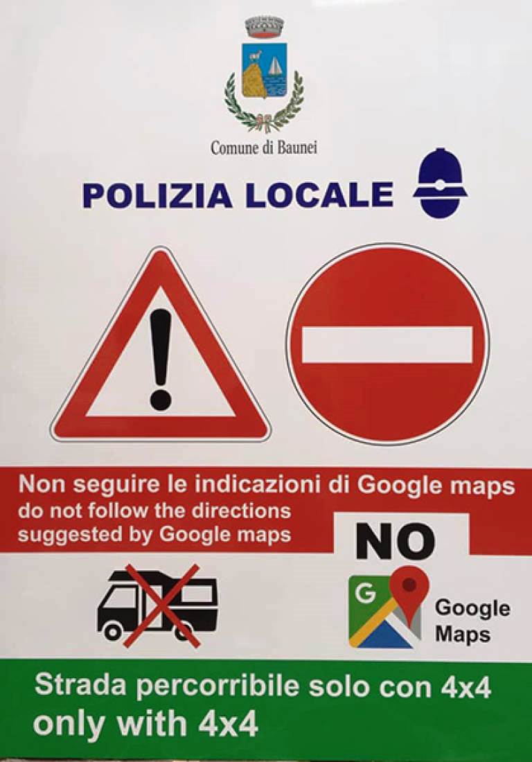 “Non seguire le indicazioni di Google Maps, strada percorribile solo con 4X4”, si legge su alcuni segnali sistemati sulle strade di Baunei, in Ogliastra. I cartelli sono stati collocati per indirizzare i vacanzieri diretti verso le spiagge di Cala Luna e Cala Goloritzè, raggiungibili soltanto a piedi con mezzo 4×4, non certo con un’utilitaria o un camper.