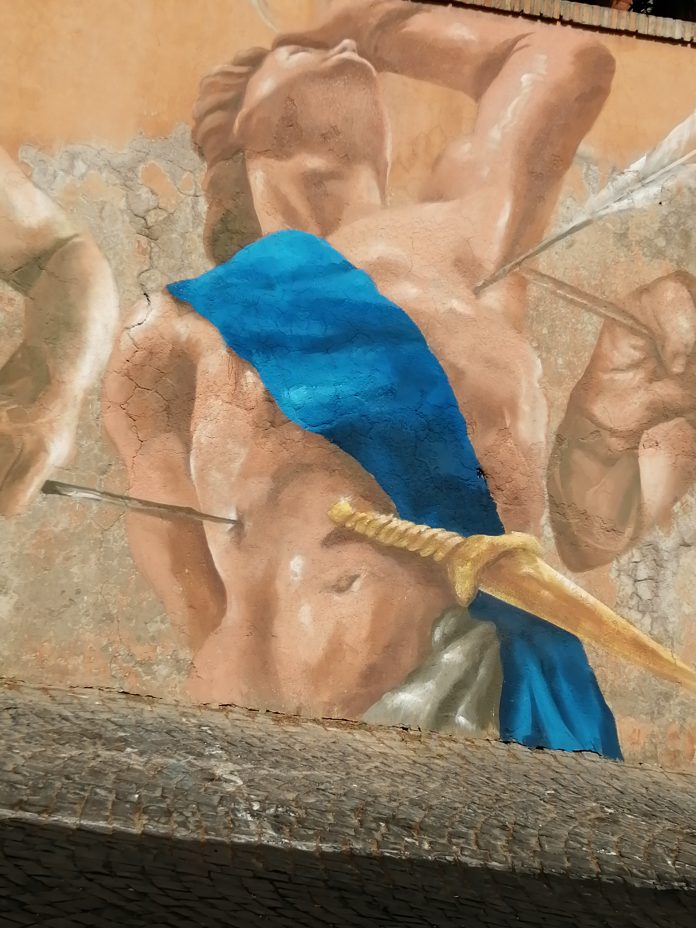 Questi versi sono di Salvo Ligama l’artista di street art che ha regalato a Ponzano il murales di S. Sebastiano. Ne spiegano il senso e l’emozione.L’opera troneggia su buona parte del grande muro di contenimento di una dimora patrizia all’ingresso della salita che porta al centro storico. Alto cinque metri e lungo circa quindici appare all’improvviso e commuove. I colori utilizzati fanno si che il quadro si compenetri con il muro sbrecciato, i muscoli del santo , le frecce nel costato hanno una tonalità che fa tutt’uno con l’antica parete, ieri sbrecciata, oggi rigenerata dall’arte.  Ligama ha un tratto gentile, non invade i luoghi dove interviene, ma con essi dialoga donando  una nuova visione. Fa così In tutta Italia , a partire dalla sua Catania. Lo stesso accade a Ponzano. Al martire Sebastiano ufficiale romano sodale dell’imperatore Diocleziano,ma poi diventato difensore dei cristiani perseguitati, morto due volte secondo la leggenda, e perciò  fatto santo da  cattolici e ortodossi infatti è dedicata una della chiese locali.