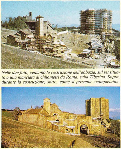A conferma ulteriore del luogo c’è anche la testimonianza dell’attore, allora esordiente, Franco Pistoni, che in un post sul suo profilo facebook, del primo ottobre 2020, rispondendo al commento di un lettore, scrive ˗ pubblicando anche alcune foto scattate sul set di Pian dell’Olmo ˗ che le scene esterne all’abbazia furono girate sulla Tiberina: “Inizialmente il film doveva essere ambientato nella piemontese Sacra di San Michele (l’abbazia valsusina ispiratrice di Eco per il suo romanzo), poi questa scelta venne reputata troppo dispendiosa dai produttori”.