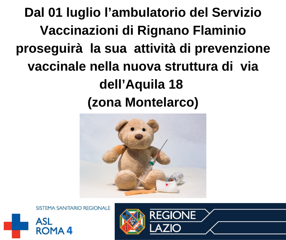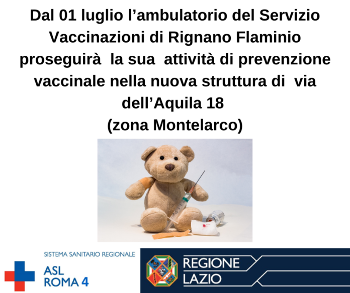 Dal 01/07/2020 l’ambulatorio del Servizio Vaccinazioni di Rignano Flaminio proseguirà la sua importante attività di prevenzione vaccinale nella nuova struttura di via dell’Aquila 18 (zona Montelarco).