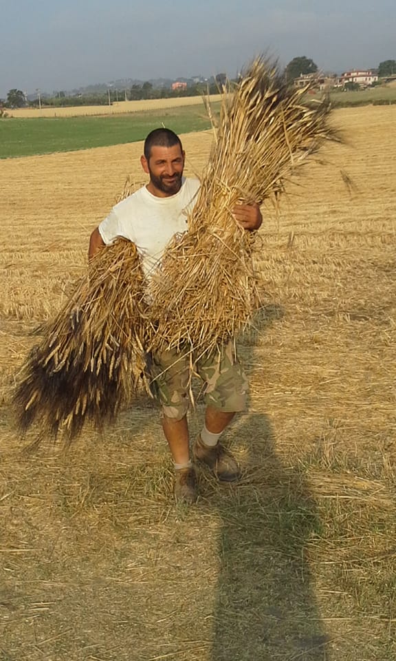 Umberto Di Pietro è un giovane agricoltore che conduce l’Azienda paterna con grande determinazione e passione. Coltiva terra sua e in affitto. Produce grano, tra cui quello pregiato, quello del senatore Cappelli. Quasi tutto lo trasforma nel suo mulino in farina pregiata e una linea di pasta. In questi giorni, insieme alla sua famiglia, sta organizzando la festa della trebbiatura che si terrà il 31 luglio. Racconta che la siccità ha creato danni ma contenuti. “I chicchi di grano quest’anno sono stati più piccoli e leggeri e dunque la resa per ettaro minore. Ma non in modo devastante. Devastante è l’incendio che ha ridotto in cenere 35 quintali di grano più pregiato, il senatore Cappelli. Complessivamente nell’area Tiberina la raccolta quest’anno ha prodotto circa 150 tonnellate di grano”. In condizioni ottimali sarebbero state, probabilmente, il 25/30% in più.
