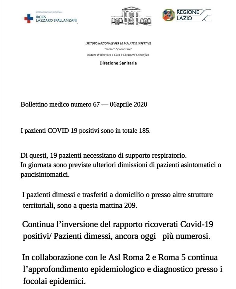 Appena emesso il bollettino odierno dello Spallanzani, dal quale esce rafforzata la tendenza emersa ieri di un maggior numero di pazienti dimessi rispetto a quello dei nuovi ricoveri.